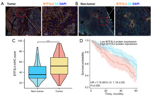 The multi-omics approach has gained significant traction in medicine and biological sciences (16). In the field of bladder cancer research, there have been a number of studies using multi-omics methods to study the correlation between target genes and the prognosis and immune cells of bladder cancer patients (17-19). In addition to assessing BTF3L4 mRNA expression through bioinformatics techniques, we conducted a more in-depth analysis of BTF3L4 protein abundance and its association with TIICs utilizing multiplex immunohistochemistry (mIHC) staining on tissue microarrays (TMAs). This comprehensive approach allowed us to investigate the association between BTF3L4 protein levels and various immune cell populations in the HCC microenvironment. We present this article in accordance with the REMARK reporting checklist (available at https://tcr.amegroups.com/article/view/10.21037/tcr-2025-aw-2179/rc).