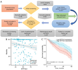 According to mIHC staining results, the quantitative score for BTF3L4 protein expression in HCC tissues, based on the positive percentage, was determined using the InForm image analysis software (version 2.6.0, PerkinElmer), with scores ranging from 0 to 100. Using X-tile software, we determined a critical value of 54.33 (cutoff) for BTF3L4 protein expression. Scores ≤54.33 were classified as low expression, and scores >54.33 were classified as high expression. We stratified 208 patients with HCC into high-expression (n=74) and low-expression (n=134) groups to assess the association between BTF3L4 protein levels and clinical features. Our analysis revealed a significant association between BTF3L4 protein levels and the TNM stage (Pearson’s χ2=9.630, P=0.008). Nevertheless, no statistically significant correlations were identified between BTF3L4 protein levels and other clinical parameters, encompassing gender, age, liver cirrhosis, differentiation status, AFP levels, and HBV infection (Table 1). The specific patient enrollment process is illustrated in the flow chart (Figure 3A). For cases with missing data, we adopted the complete case analysis method to address the missing values. However, we must also objectively acknowledge that this will exert a certain impact on the generalizability of the research conclusions.