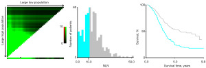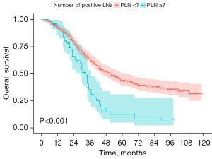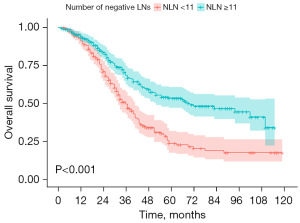 We divided patients into two groups based on PLN (group PLN <7 and group PLN ≥7) using the X-tile software (Figure 3). Survival analysis revealed that patients with PLN <7 had significantly better OS compared to those with PLN ≥7 (3-year OS rate: 63.5% vs. 36.0%; 5-year OS rate: 44.1% vs. 12.6%, P<0.001) (Figure 4). Similarly, patients were divided into two groups based on NLN (group NLN <11 and group NLN ≥11) (Figure 5). The 3-year OS rate was 49.7% for patients with NLN <11 compared with 68.6% for patients with NLN ≥11; and the 5-year OS rate was 23.9% and 53.6% for patients with NLN <11 and patients with NLN ≥11, respectively (P<0.001) (Figure 6).