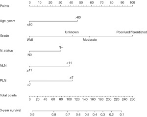 The prognostic impact of NLN in CRC has been well established in recent years. Ogino et al. reported that the survival rate of CRC patients with NLN ≥13 was significantly higher than that of patients with NLN ≤3 (P<0.001) (26). In this study, we also observed that for rectal cancer patients with liver metastases, those with more NLN had a better prognosis. The survival of patients with NLN ≥11 was better than that of patients with NLN <11 (5-year OS rate: 53.6% vs. 23.9%, P<0.001). Therefore, NLN can provide additional prognostic detail for rectal cancer patients with liver metastases. Furthermore, we developed a novel nomogram based on the variables of age, grade, N status, PLN and NLN and it resulted in more-accurate prognostic prediction for rectal cancer patients with liver metastases.