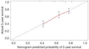 We developed a novel nomogram to estimate 3-year OS according to the independent prognostic factors indicated in the multivariate Cox analysis. The nomogram that integrated all significant independent factors for OS was shown in Figure 7. The nomogram-derived individual scores allowed for the computation of comprehensive patient-specific total scores. These cumulative scores demonstrated an inverse relationship with clinical outcomes, where elevated values correlated with diminished prognostic indicators. Internal validation of the nomogram’s predictive accuracy was conducted through bootstrap resampling analysis utilizing the original cohort of 547 cases. The C-index for prognostic nomogram was 0.67 (95% CI: 0.63–0.71). The calibration plot for the probability of 3-year survival demonstrated an optimal agreement between the predicted and actual survival (Figure 8).