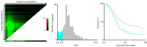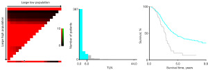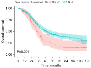 Using the X-tile software, patients were divided into two groups based on their TLN: those with TLN less than 7 and those with TLN equal to or greater than 7 (Figure 1). Notably, the survival outcomes for patients with TLN less than 7 were significantly worse compared to those with TLN equal to or greater than 7. Specifically, the 5-year overall survival (OS) rates were 22.9% and 43.8% for the respective groups (P=0.001) (Figure 2).