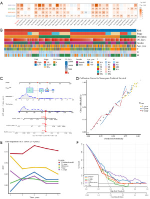 The distribution of the risk score alongside various clinical features (gender, stage, and T, N classification) is displayed in a heatmap (Figure 5B). To further validate the independence of our model, we incorporated the risk score and patient clinical indicators (including gender, age, T stage, N stage, M stage, and overall stage) into both univariate and multivariate Cox regression analyses (Figure S4). The results demonstrated that the stage and risk score served as the most reliable and independent predictors of prognosis in LUAD patients [HR = 2.214, 95% confidence interval (CI): 1.781–2.752, P<0.001], confirming LPRGs as an independent prognostic factor across all datasets (Figure S3A,S3B). A nomogram was subsequently constructed based on the overall stage and the LPRGs signature (Figure 5C), enhancing the clinical applicability of the model. The calibration curves indicated a high degree of consistency between the nomogram-predicted and the observed 1-, 3-, and 5-year OS rates. And the calibration slope for the first year reached 0.9722 (P=0.0065), with an intercept of 0.1252 (P=0.834), confirming the model’s excellent calibration and clinical utility in LUAD prognosis, which validated its clinical utility for LUAD prognosis (Figure 5D and Table S2). Time-dependent AUC analysis showed that the nomogram, which incorporated clinical factors, exhibited a superior predictive ability with AUC values consistently above 0.7. Furthermore, the AUC values demonstrated increasing stability over time (Figure 5E). Additionally, DCA confirmed that the predictive performance of this nomogram was better than that of any single clinical factor (Figure 5F).