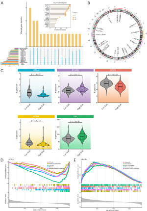 Subsequently, we applied eight individual machine learning algorithms to identify the top 19 most frequently selected genes, as well as the intersecting genes derived from all eight algorithms, to pinpoint key genes most critically associated with LUAD prognosis (Figure 6A). These genes were distributed across various chromosomes, excluding chromosomes 2, 10, 14, 18–21, and the sex chromosomes (Figure 6B). Among the top five candidate genes, TXN is recognized as a potential therapeutic target in lung cancer. It can enhance proliferation and antioxidant capacity, activate the ERK pathway, and promote immune escape, thereby being closely linked to tumor progression, poor prognosis, and resistance to immunotherapy (24,25). GPD1L and ATP8A2 have been widely implicated as playing tumor-suppressive roles in various malignancies, including LUAD (13,26,27). DNAJB4, a member of the heat shock protein family, may specifically influence lung cancer cell proliferation and tumorigenesis when downregulated (28). In contrast, the role of SCN2B in LUAD remains insufficiently studied. Kaplan-Meier survival analysis revealed that high expression of TXN and DNAJB4 was significantly associated with shorter OS in LUAD patients, while elevated expression of the other three genes also indicated a favorable prognosis (Figure S5). To investigate the functional roles of these core genes in LUAD, we examined their differential expression across various subgroups and performed GSEA. The analysis suggested that DNAJB4 might activate pathways such as endocytosis, focal adhesion, IgSF CAM signaling, and platelet activation. Conversely, ATP8A2 potentially suppresses pathways including the cell cycle and oxidative phosphorylation, influencing the TME and contributing to a hypoxic state (Figure 6C-6E and Figures S6,S7).