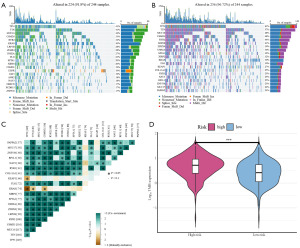 We obtained TMB data from TCGA and analyzed the mutational landscape of LUAD patients across different risk subgroups using the maftools package. The results are presented in a waterfall plot displaying the top 20 most frequently mutated genes, while a violin plot is used to compare TMB scores between the two subgroups, serving as a metric for potential response to immunotherapy.