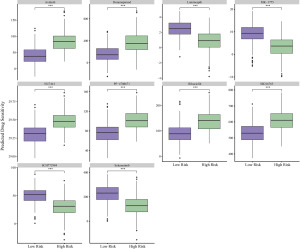 We further investigated drug sensitivity across different risk subgroups. Among the 198 chemotherapeutic agents evaluated, 70.2% (139 compounds) exhibited significant differences in IC50 values between the high- and low-risk subgroups (P<0.05), as indicated by drug sensitivity differential analysis. Figure 9 highlights the top 10 agents with the lowest P values. Compared to patients in the low-risk subgroup, those in the high-risk subgroup showed significantly lower predicted IC50 values for therapeutic agents such as luminespib, MK-1775, SCH772984, and selumetinib. This suggests that patients in the high-risk subgroup may exhibit stronger treatment responses to these drugs.