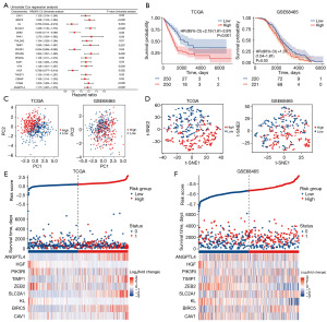 Initially, 50 AERGs were filtered out (Figure 4A). A heatmap illustrated the expression of 50 AERGs in the TCGA cohort (Figure 4B). GO enrichment analysis showed that the AERGs were significantly enriched in several biological processes, cellular components and molecular functions, such as epithelial cell proliferation, positive regulation of MAPK cascade, regulation of epithelial cell differentiation and collagen-containing ECM (Figure 4C). KEGG enrichment analysis showed that AERGs were significantly enriched in several terms, such as focal adhesion and PI3K-Akt and MAPK signaling pathways (Figure 4D). Subsequently, univariate Cox regression analysis identified 18 prognostic AERGs (Figure 5A). Then, a signature of 9 AERGs (CAV1, BIRC5, KL, SLC2A1, ZEB2, TIMP1, PIK3R1, HGF, ANGPTL4) was set up through the multivariate Cox regression analysis. The risk score was calculated as follows: risk score = (0.000794 × CAV1 expression) + (0.004126 × BIRC5 expression) + (−0.02757 × KL expression) + (0.001515 × SLC2A1 expression)+ (−0.04769 × ZEB2 expression) + (0.000339 × TIMP1 expression) + (0.018699 × PIK3R1 expression) + (−0.04393 × HGF expression) + (0.001153 × ANGPTL4 expression). As shown in Kaplan-Meier curves, patients in the high-risk group had significantly shorter survival time in the TCGA cohort (P<0.001, Figure 5B). The GSE68465 dataset was enrolled to confirm the validity of the PAEGs risk model. Patients in the high-risk group also had shorter survival times than those in the low-risk group in GSE68465 (P=0.025, Figure 5B). The patients with LUAD were divided into high- and low-risk groups with the median risk score. PCA and t-SNE analysis demonstrated a clear distinction between the risk groups (Figure 5C,5D). ROC curves showed that the areas under the ROC curve (AUC) of the TCGA cohort at 1-, 3- and 5-year were 0.673, 0.697 and 0.651 (Figure S1A). The AUCs of the GSE68465 at 1-, 3- and 5-year were 0.700, 0.498 and 0.540 (Figure S1B). The scatter plot showed that with increased risk scores, mortality escalated and survival time shortened, and the expression of PAEGs was exhibited in a heatmap (Figure 5E,5F).