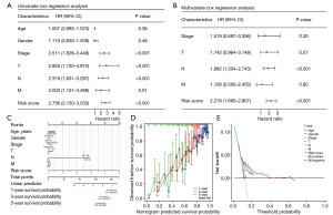 Univariate and multivariate Cox regressions were conducted to assess the risk score as an independent prognostic predictor. The univariate Cox regression analysis showed that stage, T (tumor) stage, N (node) stage, M (metastasis) stage and risk score were closely correlated to OS (Figure 6A). The multivariate Cox regression analysis further validated that the N stage and risk score were independent prognostic predictors (Figure 6B). A nomogram was developed to estimate 1-, 3-, and 5-year survival rates (Figure 6C). The calibration curves comparing 1-, 3-, and 5-year prediction and observation results were served to evaluate the model’s predictive performance (Figure 6D). DCA analysis also demonstrated its superior predictive capacity (Figure 6E).