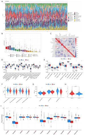 The relative abundance of immune cells in high-risk patients was evaluated through immune infiltration analysis. In addition, immune cell correlation analysis was conducted and visualized through the “corrplot” package of R. Then, single-sample GSEA (ssGSEA) was conducted to explore the differences in immune cell types and immune functions between risk groups. The R package “estimate” was employed to quantify immune and stromal cell infiltration levels within the TME of each specimen. However, both the CIBERSORT and ssGSEA methods rely on gene set and expression data and may be ineffective in complex microenvironments (31,32). The immunophenoscore (IPS) and tumor immune dysfunction and exclusion (TIDE) scores both predict immunotherapy effects, but their focus is different, with TIDE focusing on the immunosuppressive microenvironment and IPS combining PD-L1 and T-cell inflammatory features. The integrated analysis of the two approaches yields a more accurate and reliable prediction outcome. The IPS and TIDE scores were downloaded from the Tumor Cancer Immunome Atlas (https://tcia.at/home) and TIDE (http://tide.dfci.harvard.edu/login/), respectively. A differential analysis was performed to assess the effectiveness of immunotherapy between risk groups.
