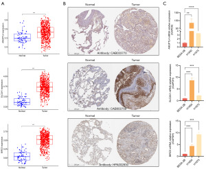 Protein expression profiles visualized through immunohistochemical staining for both LUAD and normal lung tissues were acquired from the HPA database (https://www.proteinatlas.org/). All images were generated using the standardized HPA immunohistochemistry protocol, which employs validated antibodies with visualization via a diaminobenzidine (DAB) system (33).
