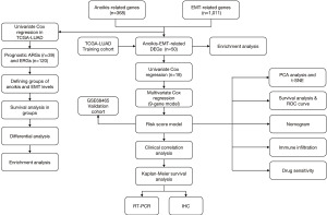 Tumor metastasis results from a complex, multistep biological process, with main pathways including lymphatic metastasis, hematogenous metastasis and implantation metastasis (19). The metastasis of malignant tumors is often the main reason for treatment failure, drug resistance and tumor-related mortality. LUAD is characterized by high invasiveness and metastasis, which is related to its strong molecular heterogeneity and the widespread distinct genomic alterations (20,21). Anoikis and EMT are mechanistically linked processes that cooperatively drive cancer invasion and metastasis. Anoikis resistance serves as an earmark of tumorigenic EMT activation (22). FAK and ILK orchestrate the coupling of anoikis resistance and EMT, while TrkB promotes survival in conditions triggering anoikis and inducing EMT (23). Here, we delineated the reciprocal regulation between anoikis resistance and EMT activation, and constructed and validated a risk prognostic model based on anoikis- and EMT-related genes. Additionally, we explored their overall effects on immunity, drug sensitivity, and prognosis. This study provides novel mechanistic insights into tumor metastasis and reveals promising therapeutic avenues. We present this article in accordance with the TRIPOD reporting checklist (available at https://tcr.amegroups.com/article/view/10.21037/tcr-2025-aw-2282/rc).