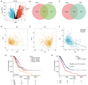 Prognostic ARGs and ERGs were identified using univariate Cox regression applied to TCGA-LUAD clinical information (P<0.05). Principal component analysis (PCA) was applied to quantify anoikis and EMT levels in individual samples, enabling construction of associated gene signatures. Signature scores were determined using principals 1 and 2 (PC1 and PC2). The Anoikis Potential Index (API) and EMT Potential Index (EPI) were separately defined with the formulas API or EPI = ∑ (PC1i + PC2i), where i is the expression of anoikis-related or EMT-related genes (27-29). Intergroup survival differences were assessed using Kaplan-Meier survival analysis.