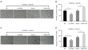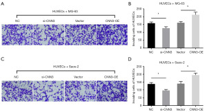 In the HUVECs + MG-63 co-culture system, the number of invading HUVECs in the si-CNN3 group was lower than in the NC group, whereas the number in the CNN3-OE group was higher than in the vector group (Figure 5A,5B). In the HUVECs + Saos-2 co-culture system, the number of invading HUVECs in each group followed the same trend as observed in the MG-63 + HUVECs co-culture system (Figure 5C,5D). The results of the Transwell invasion assay demonstrated that CNN3 silencing in MG-63 and Saos-2 cells reduced, whereas CNN3 overexpression increased, the invasive ability of HUVECs.