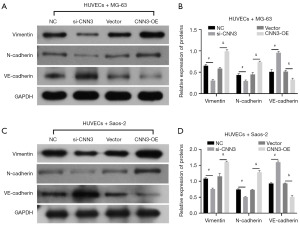 In the HUVECs + MG-63 co-culture system, compared with the NC group, the relative expression of vimentin and N-cadherin decreased, whereas VE-cadherin expression increased, in the si-CNN3 group. By contrast, compared with the vector group, the relative expression of vimentin and N-cadherin increased, whereas VE-cadherin decreased, in the CNN3-OE group (Figure 6A,6B). In the HUVECs + Saos-2 co-culture system, the expression trends of vimentin, N-cadherin, and VE-cadherin were consistent with those observed in the MG-63 + HUVECs co-culture system (Figure 6C,6D). These results suggest that CNN3 modulates the expression of EndMT-related proteins in HUVECs.