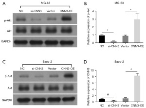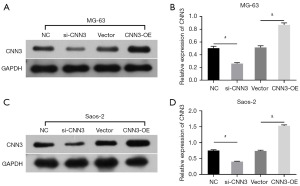 CNN3 expression was lower in the si-CNN3 group than in the NC group and higher in the CNN3-OE group than in the vector group (Figure 2). These results confirmed that CNN3 in both MG-63 and Saos-2 cells was silenced or overexpressed.