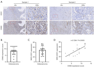 CNN3 and CD31 levels in osteosarcoma specimens was detected and the representative IHC images are shown in Figure 1A. To analyse the correlation between CNN3 and CD31. Their expression levels were quantified as CNN3 expression score (8.55±2.89; Figure 1B) or MVD (48.50±17.37; Figure 1C), respectively. Pearson’s correlation analysis (Figure 1D) showed a positive association between CNN3 expression and MVD (r=0.7264, P=0.0003), suggesting that CNN3 may contribute to vascularization in osteosarcoma.