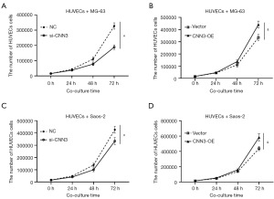In the Transwell co-culture system, HUVECs were plated in the lower chamber. MG-63 and Saos-2 cells from the CNN3-OE, vector, si-CNN3, and NC groups were added to the upper chamber. Co-culture was conducted in a 5% CO2 incubator for 0, 24, 48, or 72 h. Cell numbers were determined using a haemocytometer. Three independent experiments were performed with three technical replicates.