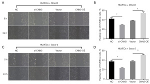 In the HUVECs + MG-63 co-culture system, the healing rate of HUVECs in the si-CNN3 group after 24 h of culture was lower than that in the NC group, whereas the healing rate in the CNN3-OE group was higher than that in the vector group (Figure 4A,4B). In the HUVECs + Saos-2 co-culture system, the healing rate of HUVECs in each group showed the same trend as in the MG-63 + HUVECs co-culture system (Figure 4C,4D). These results indicate that silencing CNN3 in MG-63 and Saos-2 cells inhibited, while overexpressing CNN3 promoted, HUVEC migration.