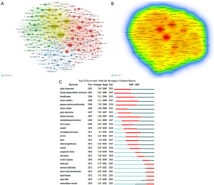 Complementing this temporal and intellectual mapping, VOSviewer is tailored for dense network visualization (24). It transforms large matrices of co-authorship, co-citation, and keyword co-occurrence into clustered maps whose node sizes and colors indicate which authors or institutions collaborate and which concepts co-occur. We used VOSviewer (version 1.6.20) with full counting and association-strength normalization to construct co-authorship maps, co-citation maps, and keyword co-occurrence networks. Minimum thresholds for publications or occurrence frequency were applied to reduce noise. Terms extracted from titles and abstracts were manually cleaned so that obvious synonyms, abbreviations, or spelling variants (for example, “hepatocellular carcinoma” or “HCC”, and “biomarker” or “tumor marker”) were merged before clustering.
