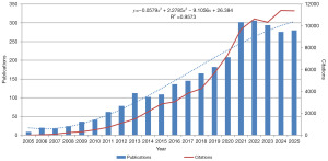 Using the predefined search strategy for liver cancer, biomarkers, and pathology, we identified 2,907 English-language articles and reviews in WoSCC published between 2005 and 2025 (Figure 1). The annual number of publications increased from 9 in 2005 to 280 in 2025, representing more than a 30-fold rise and an approximate compound annual growth rate of 18–19% over the study period. The number of publications remained relatively low before 2010 (148 publications, 5.1% of the total), then experienced a phase of steady growth during 2011–2015 (463 publications, 15.9%) and a marked expansion in 2016–2020 (836 publications, 28.8%). Notably, 50.2% of all publications (1,458/2,907) were produced in the most recent five years (2021–2025), underscoring the recent intensification of research at the intersection of HCC, pathology, and biomarker discovery. The cumulative number of publications increased almost linearly on a logarithmic scale, reaching 2,625 by 2024 and 2,907 by 2025. To further analyze this trend, a third-order polynomial regression fitted to the annual publication counts showed an excellent overall fit to the data (R2=0.96), indicating a sustained long-term upward trajectory rather than short-term random fluctuations.
