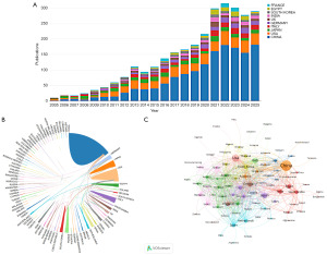 Institutional contributions further reinforce this pattern of concentration. All of the top 10 most productive institutions are based in mainland of China and together account for roughly one-fifth of the global output (609/2,907). Fudan University leads with 107 publications and the highest institutional network centrality (0.22), followed by Sun Yat-Sen University (101 publications; centrality 0.12) and Zhejiang University (73 publications; centrality 0.05). Shanghai Jiao Tong University and Nanjing Medical University combine substantial productivity (67 and 56 papers) with relatively high centrality (both 0.10), indicating that they act not only as volume centers but also as key domestic connectors. These metrics depict a system in which China dominates quantitative output and much of the collaboration architecture, whereas international knowledge brokerage is concentrated in a limited subset of highly central academic hubs. This structure highlights considerable scope for broader North-South and South-South integration in future multicenter studies.