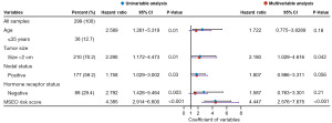 The clinical features of the patients in discovery set II (n=299) are itemized in Table S4. In this set, the univariable Cox proportional hazards regression analysis for OS identified a hazard ratio (HR) of 4.385 for each one-unit increase in the risk score [95% confidence interval (CI): 2.914–6.600; P<0.001], signifying a markedly elevated risk of mortality. Additionally, factors such as younger age (≤35 years compared to 35–50 years: HR =2.589; 95% CI: 1.261–5.319; P=0.01), larger tumor size (>2 cm compared to ≤2 cm: HR =2.290; 95% CI: 1.172–4.473; P=0.01), nodal status (positive versus negative: HR =1.758; 95% CI: 1.029–3.002; P=0.03), and hormone receptor-negative status (negative versus positive: HR =2.792; 95% CI: 1.426–5.464; P=0.003) were significantly correlated with an increased incidence of clinical events. These significant variables were included in a multivariable Cox model, where risk score remained a robust independent predictor of OS (HR =4.447; 95% CI: 2.576–7.675; P<0.001). Detailed results are illustrated in Figure 5.