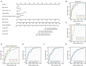 A decline in AUC values, particularly for the 8-year OS prediction in the external validation cohort (0.756 vs. 0.873 in the training set), was observed and is consistent with patterns reported in prior prognostic modeling studies, including the methylation-based model developed by Peng et al. (22). This attenuation likely reflects inherent cohort heterogeneity—including differences in patient demographics, treatment strategies, and follow-up schedules between the independent validation set and the original training cohorts—which can lead to a modest attenuation in model performance. Furthermore, predicting long-term outcomes (e.g., 8-year OS) is inherently more challenging due to the increasing influence of competing risks and unmeasured variables over time, which may explain the more pronounced decrease at the later time point. Notably, the AUCs for 3- and 5-year OS in the external set remained high (0.856 and 0.868, respectively), underscoring the model’s robust and reliable predictive capability within a clinically relevant mid-term horizon. Together, the resulting nomogram provides a refined, statistically robust tool to assist clinicians in formulating individualized management strategies for patients with EOBC.