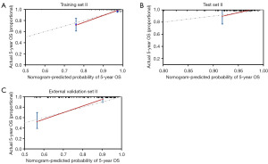 To identify the optimal prognostic nomogram, this study compared the predictive accuracy of the nomogram with that of the MSEO across all available cases (n=384) (Figure 6E-6G). Time-dependent ROC analysis at 3- and 5-year intervals demonstrated that the nomogram achieved significantly higher AUC values compared to the MSEO alone (both adjusted P<0.05), underscoring its superior performance in predicting OS in EOBC patients. Furthermore, calibration curve analysis demonstrated strong agreement between the nomogram-predicted and observed probabilities of 5-year OS across all three datasets (Figure 7), supporting good calibration performance of the model.
