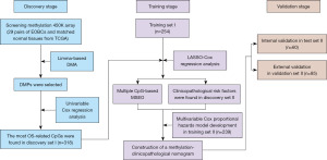 First, raw IDAT files were processed using the ChAMP pipeline (25). Probes with detection P values >0.01, those located on sex chromosomes, or those containing SNPs were excluded. Subsequently, beta-mixture quantile normalization was applied to correct for probe-type bias. Batch effects were mitigated via champ.runCombat function. Beta values (β), where β = M/(U + M + 100) (M = methylated signal intensity; U = unmethylated signal intensity), represented methylation levels. In GSE75067, k-nearest neighbors imputation was used for probes with <10% missingness. Next, DMPs between EOBC and normal tissues were identified using limma package with empirical Bayes moderated t-tests (26). Significance thresholds were false discovery rate (FDR)-adjusted P<0.05 and |Δβ| ≥0.2. Based on these DMPs, univariable Cox regression (P≤0.001) identified OS-associated CpGs in the discovery set I.