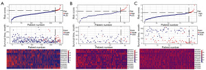 To enhance the prognostic evaluation, the optimal cutoff value for the risk score was determined to be −1.971, categorizing patients into high-risk (risk score >−1.971) and low-risk groups based on this threshold. Figure 3A-3C illustrates the distribution of risk scores, risk stratification, survival outcomes, and methylation levels within the prognostic model for the training set I, test set I, and validation set I.