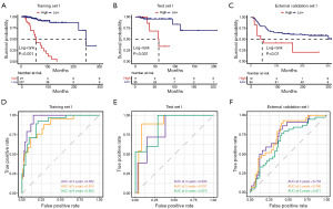 Subsequently, KM survival analysis was employed to compare survival outcomes between the high-risk and low-risk cohorts. The analysis revealed that patients classified within the high-risk group exhibited significantly shorter OS than those in the low-risk group, as evidenced by the log-rank test (P<0.001; Figure 4A). This pattern was consistently observed in both the internal test set I and the external validation set I, with P values of <0.001 and 0.01, respectively (Figure 4B,4C). Additionally, time-dependent ROC analysis was utilized to assess the sensitivity and specificity of the methylation signature in predicting OS. In training set I, the area under the curve (AUC) values for predicting 3-, 5-, and 8-year OS were 0.952, 0.874, and 0.903, respectively (Figure 4D). The AUC values in test set I were 0.833, 0.911, and 0.876 for 3-, 5-, and 8-year OS, respectively (Figure 4E). In the validation set I, the corresponding AUC values were 0.753, 0.760, and 0.671 (Figure 4F). Overall, all analyses highlight the robust prognostic performance of MSEO.