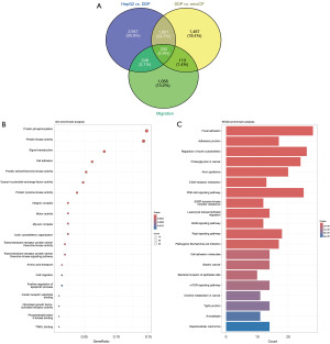 Next, we identified the intersection of differential genes between the HepG2 and DDP groups, the DDP and emoCP groups, and migration-related genes to demonstrate the effect of cisplatin on HCC and confirm the potentiation of cisplatin by emodin. The results revealed a total of 232 genes (Figure 4A), which were then subjected to GO and KEGG analysis (Figure 4B,4C). KEGG pathway analysis revealed significant enrichment in choline metabolism, ErbB signaling pathway, epidermal growth factor receptor tyrosine kinase, HCC, mTOR signaling pathway, gastric cancer, migration, Rap1 signaling pathway, and PI3K-Akt signaling pathway in cancers. GO enrichment analysis primarily identified pathways involved in protein phosphorylation, apoptosis, cell migration, and amino acid transport. The analysis indicated that the Rap1 signaling pathway plays a critical role in the potentiation of cisplatin by emodin in HCC cells. Emodin enhanced the anticancer effect of cisplatin by inhibiting cell migration.