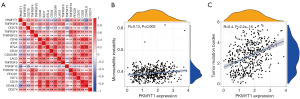 Univariate and multivariate Cox regression analyses were performed to identify independent prognostic factors associated with patient survival (20). The analysis incorporated PKMYT1 expression, tumor stage, age, and gender, facilitating a comprehensive assessment of their collective impact on survival outcomes. Following this, a nomogram was developed using the “rms” package in R, allowing for individualized predictions of survival probabilities at 1, 3, and 5 years based on the aforementioned variables (21,22). Calibration plots were generated to compare predicted survival rates with observed rates, with the 45-degree line indicating a perfect predictive model. This graphical representation aids in evaluating the nomogram’s accuracy and reliability in forecasting survival outcomes for patients with LUAD.