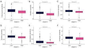 The in silico drug sensitivity analysis revealed that high PKMYT1 expression was significantly associated with predicted higher IC50 values for several widely used chemotherapeutic agents, including 5-fluorouracil, cisplatin, crizotinib, erlotinib, gemcitabine, and irinotecan (Figure 8A-8F, P<0.001). These computational predictions are consistent with a potential association between high PKMYT1 expression and drug resistance mechanisms, supporting further investigation into its role as a predictive biomarker worthy of further clinical validation for forecasting treatment response in LUAD.