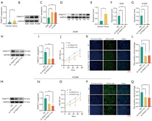 qPCR analysis revealed that PKMYT1 expression was significantly higher in LUAD cells compared to normal cells (Figure 10A, P<0.01). Western blot analysis of LUAD cell lines confirmed the upregulation of PKMYT1 at the protein level (Figure 10B,10C, P<0.01). To further validate this finding in patient-derived materials, we performed Western blot analysis on a subset of 39 paired LUAD clinical specimens. Detailed clinicopathological characteristics of these tissue samples are provided in table available at https://cdn.amegroups.cn/static/public/tcr-2025-1640-1.xlsx. The results confirmed that PKMYT1 protein expression was significantly higher in tumor tissues compared to their matched adjacent normal tissues (P<0.05, Figure 10D,10E). Upon knockdown of PKMYT1 using siRNA, its mRNA level was significantly reduced in A549 cells (Figure 10F, P<0.05) and H1299 cells (Figure 10G, P<0.05). The protein levels were correspondingly decreased in A549 cells (Figure 10H,10I, P<0.05). PKMYT1 knockdown significantly inhibited the proliferation of A549 cells (CCK-8 assay, Figure 10J, P<0.05), which was further confirmed by EdU assays (Figure 10K,10L, P<0.05). Similarly, the protein levels were decreased in H1299 cells (Figure 10M,10N, P<0.05). The proliferation of H1299 cells was also inhibited (CCK-8 assay, Figure 10O, P<0.05), as confirmed by EdU assays (Figure 10P,10Q, P<0.05).