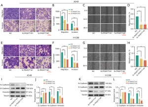 Transwell assays showed that PKMYT1 knockdown significantly reduced the migration and invasion abilities of A549 cells (Figure 11A,11B, P<0.01). Wound-healing assays further confirmed that the migration rates of H1299 cells were markedly decreased at 24 and 48 hours following PKMYT1 knockdown (Figure 11C,11D, P<0.01). Similarly, the migration and invasion abilities of H1299 cells were significantly reduced (Figure 11E,11F, P<0.001), and the migration rates of A549 cells were also markedly decreased (Figure 11G,11H, P<0.01). Moreover, Western blot analysis revealed that in A549 cells, PKMYT1 knockdown led to an increase in E-cadherin expression and a decrease in N-cadherin and Vimentin levels (Figure 11I,11J, P<0.01). The same trend was observed in H1299 cells, with increased E-cadherin and decreased N-cadherin and Vimentin levels (Figure 11K,11L, P<0.01), indicating a reversal of epithelial-mesenchymal transition (EMT). These findings suggest an association between PKMYT1 expression and enhanced migratory and invasive capacities in LUAD cells, potentially mediated through EMT regulation.