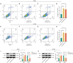 Flow cytometry analysis revealed that PKMYT1 knockdown significantly increased the apoptosis rates in A549 cells (Figure 12A-12D, P<0.01) and H1299 cells (Figure 12E-12H, P<0.01), with the proportion of apoptotic cells being markedly higher in the si-PKMYT1 groups compared to the negative control (NC) group. Western blot analysis further demonstrated that PKMYT1 knockdown upregulated the expression of the pro-apoptotic protein Bax and downregulated the expression of the anti-apoptotic protein Bcl-2 in A549 cells (Figure 12I,12J, P<0.01) and H1299 cells (Figure 12K,12L, P<0.05).