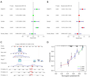 The univariate Cox regression analysis revealed that PKMYT1 [hazard ratio (HR) =1.354, 95% confidence interval (CI): 1.126–1.628, P=0.001] and tumor stage (HR =1.383, 95% CI: 1.251–1.530, P<0.001) were significant indicators of survival in patients with LUAD (Figure 3A). Conversely, age (HR =1.010, 95% CI: 0.995–1.026, P=0.20), gender (HR =1.157, 95% CI: 0.856–1.564, P=0.34) and smoking status (HR =0.899, 95% CI: 0.651–1.240, P=0.52) did not demonstrate a meaningful impact on survival outcomes. In the multivariate analysis, the independent prognostic relevance of PKMYT1 (HR =1.334, 95% CI: 1.103–1.613, P=0.003) and tumor stage (HR =1.370, 95% CI: 1.235–1.519, P<0.001) was further confirmed (Figure 3B). Age was also identified as significant (HR =1.016, 95% CI: 1.001–1.033, P=0.04), while gender (HR =1.047, 95% CI: 0.773–1.419, P=0.77) and smoking status (HR =0.868, 95% CI: 0.627–1.201, P=0.39) did not show a significant association. A nomogram was constructed, integrating age, gender, PKMYT1, and tumor stage (Figure 3C), to predict the probabilities of 3- and 5-year survival based on cumulative scores. The calibration curves for 1-, 3-, and 5-year OS indicated a high level of consistency between predicted and actual survival rates (Figure 3D), with the curves aligning closely to the ideal 45-degree line, emphasizing the model’s strong predictive capability. Furthermore, decision-curve analysis (DCA) demonstrated that the nomogram provided significant clinical net benefit across a range of threshold probabilities for predicting 1-, 3-, and 5-year OS (Figure S2C).