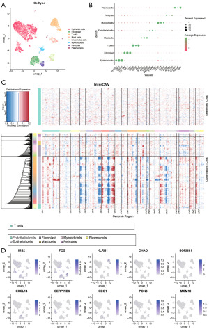 To further understand the expression patterns of the hub biomarkers in ILC, the expression of 10 hub biomarkers in various ILC cell types was explored via the scRNA-seq dataset GSE245601. After initial quality control, 10,787 cells were obtained. Unbiased clustering identified 8 main cell types on the basis of Uniform Manifold Approximation and Projection (UMAP) analysis according to the gene profiles and typical markers of the cells (Figure 5A). Specifically, epithelial cells highly express EPCAM, KRT8, and KRT18; fibroblasts highly express COL1A1, DCN, and LUM; T cells highly express CD3D, CD3E, and CD2; mast cells highly express PECAM1, SYTL3, and TPSB2; endothelial cells highly express PECAM1, PLVAP, and VWF; myeloid cells highly express CD68, LYZ, and CD14; pericytes highly express RGS5, ACTA2, and MCAM; and plasma cells highly express JCHAIN, IGHG1, and IGKC (Figure 5B) (25,26). The heatmap further confirmed that the identified epithelial cells were malignant (Figure 5C). The feature plots revealed the expression patterns of the 10 hub biomarkers: IRS2 was expressed mainly in fibroblasts, epithelial cells, and pericytes; FOS was expressed mainly in pericytes, fibroblasts and endothelial cells; KLRB1 was expressed mainly in T cells; CXCL14 was expressed mainly in fibroblasts; CHAD, SORBS1, SERPINB5 and PON3 were expressed mainly in epithelial cells; and CDO1 and MCM10 were expressed at low levels across the 8 cell types (Figure 5D). This analysis demonstrates that the prognostic markers of ILC originate from both tumor cells and the TME, reflecting the disease’s complexity.