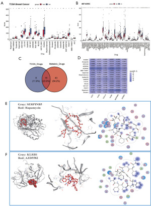 To generate hypotheses regarding potential therapeutic strategies, we performed an exploratory drug sensitivity analysis on high- and low-risk groups (defined by the Nomogram). We identified 24 and 59 differentially sensitive drugs in the TCGA and METABRIC cohorts, respectively, based on unadjusted P values (P<0.05; Figure 6A,6B), yielding hypothesis-generating therapeutic candidates. Sixteen drugs showed consistent sensitivity across both cohorts (Figure 6C). Specifically, the high-risk group was more sensitive to acetalax, afuresertib, AZD5363, AZD5582, dihydrorotenone, ipatasertib, lapatinib, LCL161, ML323, OSI-027, P22077, rapamycin and sinularin. The low-risk group was more sensitive to AZD1332, BMS-754807, and daporinad. The protein structures of CDO1, CHAD, CXCL14, FOS, IRS2, KLRB1, MCM10, SERPINB5, and SORBS1 were searched in the UniProt database, with the search criteria “Reviewed” and “Human”. The protein structures of the four hub biomarkers, FOS, IRS2, MCM10, and PON3, were not determined. The “PDB Format” files for the 6 biomarkers were downloaded. The structures of the 16 drugs used were downloaded from PubChem. Molecular docking analysis of 16 drugs with 6 proteins was conducted via MOE software, and a heatmap of the best docking scores is presented in Figure 6D. More details can be found in Table S7. Among the 6*16 molecular docking results, rapamycin and AZD5582 were able to bind to all 6 proteins. The top 2 proteins and small molecules on the basis of their binding scores were selected for interaction analysis (Figure 6E,6F). These hypothesis-generating findings suggest that KLRB1 and SERPINB5 are hypothesis-generating targets for ILC treatment and that rapamycin and AZD5582 are hypothesis-generating drug candidates for ILC treatment, warranting future experimental validation.