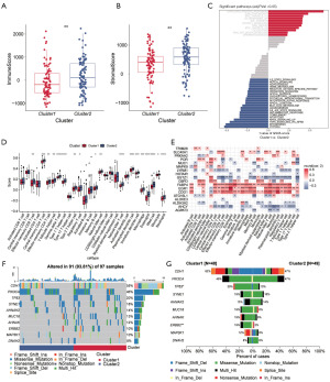 The high-risk phenotype of Cluster 1 was characterized by an immunologically “cold” TME, whereas Cluster 2 exhibited a “hot” TME associated with inflammatory and immune-activated pathways. To demonstrate this, we found that Cluster 1 had significantly lower immune and stromal scores than Cluster 2 (both P<0.01, Figure 2A,2B), suggesting these are hypothesis-generating observations. Correspondingly, GSVA revealed that pathways related to myogenesis, TNFα signaling via NF-κB, apoptosis, and inflammatory response were significantly enriched in Cluster 2 (Figure 2C). ssGSEA further confirmed a significantly greater infiltration of various immune cells in the “hot” TME of Cluster 2 (Figure 2D,2E), providing hypothesis-generating evidence of immune activation. These findings were robustly validated in the independent METABRIC cohort (Figure S3A-S3E).