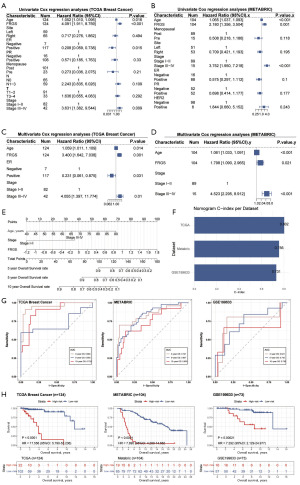 To enhance clinical utility, we integrated the FRGS with clinical features. Univariate and multivariate Cox regression analyses identified the FRGS, age, and stage as independent risk factors for ILC (Figure 4A-4D). A nomogram incorporating these three variables was constructed (Figure 4E). This combined model demonstrated superior predictive power, with C-indices of 0.802 (TCGA), 0.756 (METABRIC), and 0.731 (GSE199633) (Figure 4F). The time-dependent ROC curves also showed excellent performance, with 3-, 5-, and 10-year AUCs reaching as high as 0.950 in the TCGA cohort (Figure 4G). The nomogram successfully stratified patients into distinct high- and low-risk groups with significantly different survival outcomes. For instance, in the TCGA cohort, the high-risk group defined by the nomogram was associated with a significantly increased risk of death compared to the low-risk group (HR =17.556, 95% CI: 5.790–53.263, P<0.05). A similar prognostic value was observed in the METABRIC validation cohort (HR =7.895, 95% CI: 4.280–14.562, P<0.05; Figure 4H), further confirming its clinical utility for prognostic assessment. Furthermore, the PH assumption for the nomogram model was assessed within the TCGA training cohort using Schoenfeld residuals. The global test resulted in P=0.64, confirming that the PH assumption holds true for our nomogram model (P>0.05; Figure S7B). The model’s clinical net benefit and calibration were further confirmed by DCA (Figure S8A-S8C) and calibration curves (Figure S8D-S8L).