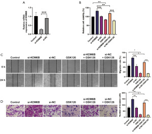 KDM6B silencing in SKOV3 cells was accompanied by H3K27me3 inhibition using GSK126, and subsequent evaluations focused on cell proliferation, migration, and invasion. qPCR analysis (Figure 4A) verified a substantial decrease in KDM6B mRNA expression after si-KDM6B treatment, while GSK126 treatment did not alter its transcriptional level. CCK-8 assay (Figure 4B) showed increased proliferative activity upon KDM6B depletion, with partial suppression observed after GSK126 administration. Wound healing and Transwell invasion assays (Figure 4C,4D) further demonstrated that KDM6B loss increased the migratory and invasive behaviors of ovarian cancer cells, while GSK126 intervention attenuated these pro-migratory and pro-invasive effects. Overall, the results highlight KDM6B as a negative regulator of ovarian cancer progression and point to EZH2 inhibition as a means of mitigating the aggressive phenotype associated with its loss.