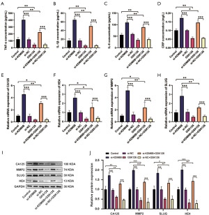 The H3K27me3 inhibitor GSK126 was applied to KDM6B-depleted SKOV3 cells to evaluate its effects on inflammatory cytokine secretion and EMT-related gene expression. ELISA results (Figure 5A-5D) demonstrated that KDM6B knockdown markedly increased TNF-α, IL-1β, IL-6, and CRP secretion, whereas GSK126 markedly reduced their levels. Consistently, RT-qPCR analysis (Figure 5E-5H) showed that KDM6B depletion led to a significant upregulation of CA125, HE4, MMP2, and SLUG mRNA expression, while GSK126 intervention reversed these changes to varying degrees. GSK126 alone also suppressed cytokine release and EMT-related gene expression. Western blot (Figure 5I) and densitometric quantification (Figure 5J) confirmed that protein levels followed a similar trend, with elevation in the si-KDM6B group and reduction upon GSK126 treatment. These results not only confirmed the partial “rescue” effect of GSK126 at the functional phenotype level but also demonstrated its ability to suppress the pro-inflammatory and EMT molecular network activated by KDM6B loss. Furthermore, they highlight that reducing H3K27me3 accumulation can mitigate the epigenetic imbalance caused by KDM6B deficiency, thereby alleviating the invasive phenotype and inflammatory microenvironment of ovarian cancer cells.