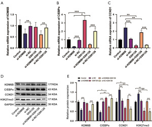 The effects of GSK126 on the KDM6B/C/EBPα axis were examined in KDM6B-depleted SKOV3 cells. qPCR analysis (Figure 6A-6C) showed that KDM6B deficiency markedly suppressed its own mRNA expression, which remained unchanged after GSK126 treatment. C/EBPα mRNA levels were substantially reduced following KDM6B loss but were partially restored by GSK126, suggesting that its downregulation may be associated with increased H3K27me3 deposition. Conversely, CCND1 mRNA exhibited an opposite trend, with upregulation in KDM6B-deficient cells and reduction after GSK126 treatment, suggesting that CCND1 transcription may be suppressed upon C/EBPα restoration. Protein-level analysis (Figure 6D) mirrored these transcriptional changes. KDM6B protein expression was markedly reduced in the KDM6B-deficient group, with no change following GSK126 treatment. C/EBPα protein decreased upon KDM6B loss but was restored by GSK126, whereas CCND1 protein increased in KDM6B-deficient cells and was reduced after GSK126 treatment. H3K27me3 levels were significantly elevated in KDM6B-deficient cells and effectively reduced following GSK126 intervention. Densitometric quantification of protein bands (Figure 6E) confirmed these trends. Taken together, GSK126 does not directly affect KDM6B expression but restores C/EBPα expression and suppresses excessive CCND1 activation by reducing H3K27me3 levels, partially correcting the epigenetic and transcriptional imbalances associated with KDM6B deficiency and thereby alleviating malignant phenotypes.