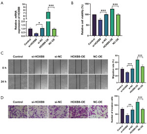 Stable HOXB8 overexpression (HOXB8-OE) and knockdown (si-HOXB8) models were generated in SKOV3 cells and qPCR confirmed the expected changes in HOXB8 mRNA expression (Figure 1A). Assessment of cell proliferation using CCK-8 assays revealed that the HOXB8-OE cells displayed higher viability at all examined time points, while HOXB8 silencing markedly suppressed cell growth (Figure 1B). Wound-healing assays demonstrated an accelerated closure rate at 24 h in the HOXB8-OE cells relative to controls, whereas delayed closure was observed in the si-HOXB8 group (Figure 1C). Furthermore, Transwell assays indicated that HOXB8-OE markedly promoted cell invasion, whereas HOXB8 knockdown resulted in a pronounced reduction in invasion (Figure 1D). Collectively, HOXB8 enhances the proliferative, migratory, and invasive capacities of ovarian cancer cells, thereby highlighting its potential involvement in disease progression.