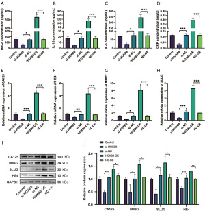 ELISA assays demonstrated that HOXB8 overexpression markedly enhanced the concentrations of TNF-α, IL-1β, IL-6, and CRP in the culture supernatant, whereas silencing HOXB8 led to significant reductions in these cytokines (Figure 2A-2D), suggesting that modulation of HOXB8 activity altered the inflammatory cytokine profile of ovarian cancer cells. In parallel, Figure 2E-2H illustrated that HOXB8 overexpression significantly upregulated the mRNA expression of CA125, HE4, MMP2, and SLUG, while HOXB8 knockdown produced the opposite effect. Consistently, Western blotting revealed that CA125, HE4, MMP2, and SLUG proteins displayed changes that mirrored their transcriptional profiles (Figure 2I), with band densitometry analysis (Figure 2J) showing similar trends across groups. Overall, these results reveal that HOXB8 acts as a key promoter of phenotypic transformation by upregulating EMT-related molecules and enhancing pro-inflammatory cytokine secretion, thereby fostering a tumor microenvironment favorable to ovarian cancer progression and underscoring its potential role in driving invasion and metastasis.
