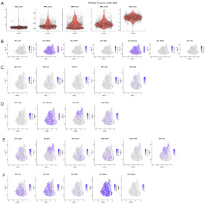 To further assess the biological significance of each cluster, the module scores for five differentiation stages [HSC, MPP, CMP, GMP, and terminal differentiation (Diff)] were calculated using the AddModuleScore function. Each cell was assigned a developmental label based on the highest score among the five. For example, in Cluster 0, the Diff score was the highest (n=1,359), compared to GMP (n=55) and CMP (n=38), indicating that this population primarily comprised terminally differentiated cells (Figure 5A). Expression plots of stage-specific markers within Cluster 0 (Figure 5B-5F) confirmed the high expression of CD14, CD68, and S100A9, further validating its differentiated identity. The same approach was applied to the remaining 10 clusters [see online figure 2 (available at https://cdn.amegroups.cn/static/public/tcr-2025-aw-2307-2.pdf)], allowing for functional annotation of each subpopulation, which will be further validated through trajectory inference and enrichment analyses. These results collectively demonstrate that AML comprises multiple subpopulations at different developmental stages, with distinct dedifferentiation characteristics, underscoring its intratumoral heterogeneity.