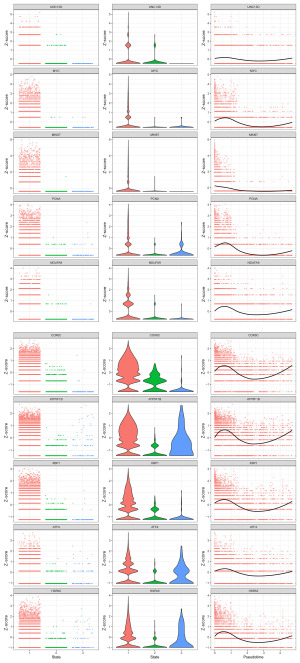 The pseudotemporal trajectory revealed co-upregulation of UNC13D and multiple pathway-related genes in intermediate AML states. To further explore the functional implications of UNC13D in AML progression, joint expression trends were analyzed along pseudotime for UNC13D and representative genes from 15 highly correlated Hallmark pathways (e.g., MYC targets, oxidative phosphorylation, UPR, and ROS pathways). A total of 46 key genes were selected for analysis, followed by Z-score normalization and three-layer visualization: dot plots of differentiation states, violin plots of expression distribution, and scatter plots with locally estimated scatterplot smoothing (LOESS) regression to capture pseudotemporal trends. As illustrated in Figure 9, UNC13D showed peak expression in State 2, alongside stress-response genes such as XBP1, HSPA5, and ATF4. Concurrent upregulation of proliferation-associated genes (e.g., MYC, MKI67, PCNA) was also observed in this intermediate state. Together, these observations indicate that UNC13D expression is closely coordinated with stress-response and proliferative programs during the intermediate phase of AML differentiation. Rather than implying a direct regulatory role, the co-expression patterns suggest that UNC13D marks a cellular state characterized by enhanced metabolic activity and stress adaptation.