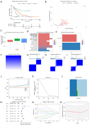Several MYC pathway-related genes are significantly associated with OS in LAML patients, and clustering based on their expression effectively stratifies high- and low-risk populations. Integrating results from single-cell analysis, UNC13D was found to be most highly expressed in the CMP-like AML subpopulation, which also exhibited the highest MYC pathway activity. Based on this observation, 200 genes from the HALLMARK_MYC_TARGETS_V1 gene set were selected for univariate Cox regression analysis using TCGA-LAML bulk transcriptomic data. A total of 22 genes were identified as significantly associated with OS (P<0.05). Consensus clustering based on the expression profiles of these genes (K =3) classified patient samples into three distinct subgroups. Kaplan-Meier survival analysis revealed significant differences in OS among the clusters (P<0.001; Figure 10A). Differential expression analysis between Cluster 2 and Cluster 1 identified 13 key genes [|log2fold change (FC)| >0.5, adjusted P<0.05] (Figure 10B), which were subsequently used for risk model construction. Notably, Cluster 2 exhibited the highest MYC pathway activity (Figure 10C). Pairwise comparisons revealed a statistically significant difference between Clusters 1 and 2 (P=0.03), which supported their selection for downstream differential expression analysis. Gene Ontology (GO) and Kyoto Encyclopedia of Genes and Genomes (KEGG) enrichment analyses of these genes indicated significant involvement in essential biological processes such as DNA replication, double-strand break repair, and cell cycle regulation, supporting their potential roles as drivers of AML proliferation and progression (Figure 10D,10E). A multigene prognostic model was then constructed using LASSO-Cox regression based on the above DEGs (Figure 10F-10L). Ten-fold cross-validation was used to determine the optimal λ value, ultimately identifying eight prognostically relevant genes. Among them, PRDX4, KPNB1, DEK, GLO1, and MCM5 were positively correlated with risk (risk factors), while ABCE1, ODC1, and CCNA2 were negatively correlated (protective factors) (see Table S1). Hazard ratios (HRs) and 95% confidence intervals (CIs) for each gene were visualized using a forest plot (Figure 10M). The minimal cross-validation error and coefficient trajectories further supported the robustness of the model (Figure 10N,10O).